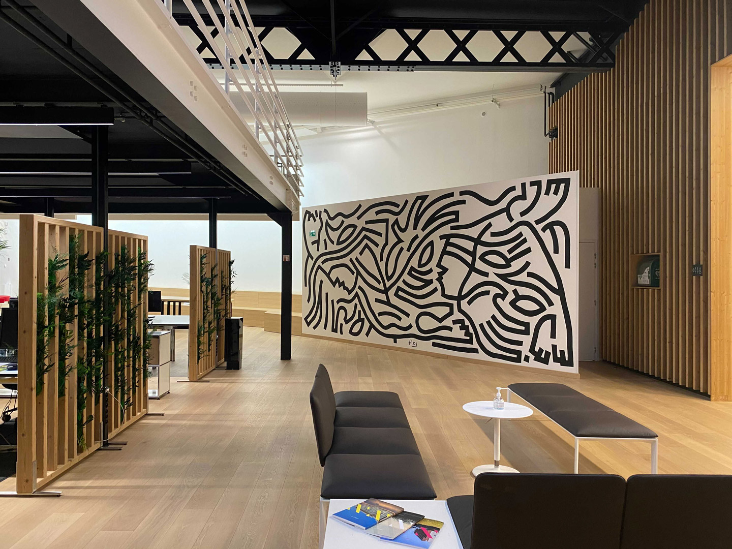 Au cœur de l’open-space, sous un des puits de lumière, nous avons installé un îlot de trois grandes plantes naturelles autour desquelles les collaborateurs pourront venir s’asseoir, se reposer et échanger au contact de la nature. Ces plantes majestueuses hautes de plus de deux mètres semblent petite face à l’immense hauteur sous plafond.