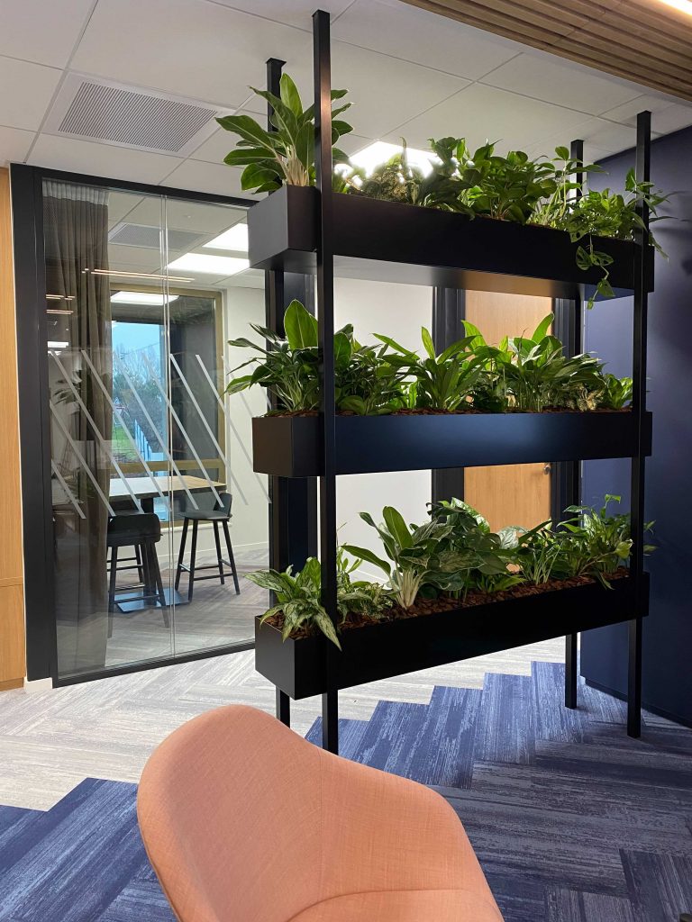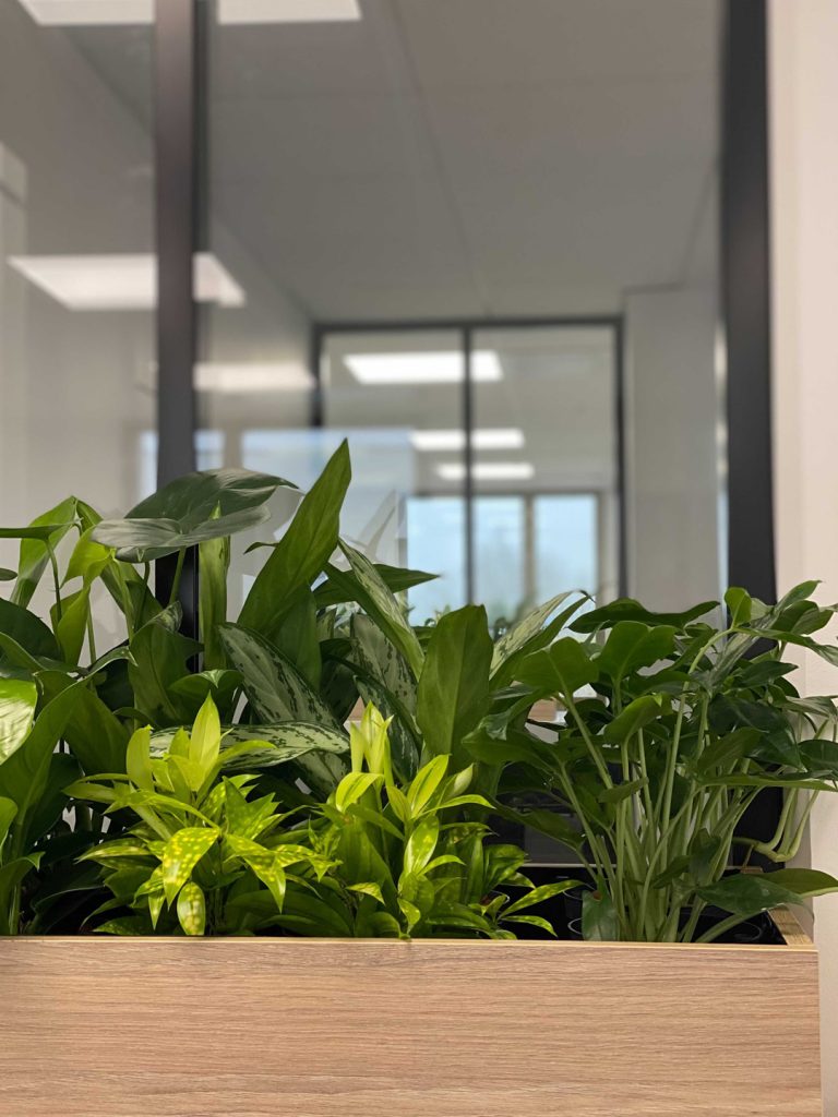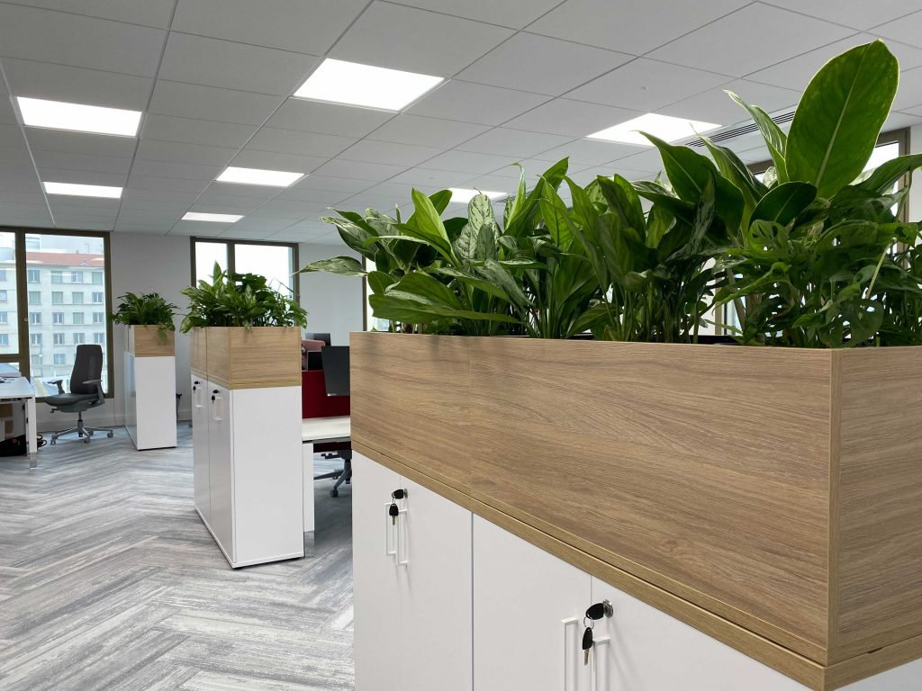 La présence du végétal dans l’aménagement intérieur imaginé par Aurélie Guyochon et les collaborateurs de Demathieu Bard est née d’une volonté mutuelle qui s’est présentée très naturellement et très vite dans le projet de co-construction. Dans l’aménagement des espaces de travail de Demathieu Bard le végétal est complètement intégré au concept d’agencement. Ce ne sont pas seulement des jardinières décoratives, elles jouent le rôle de séparateur, elles créent les espaces.
